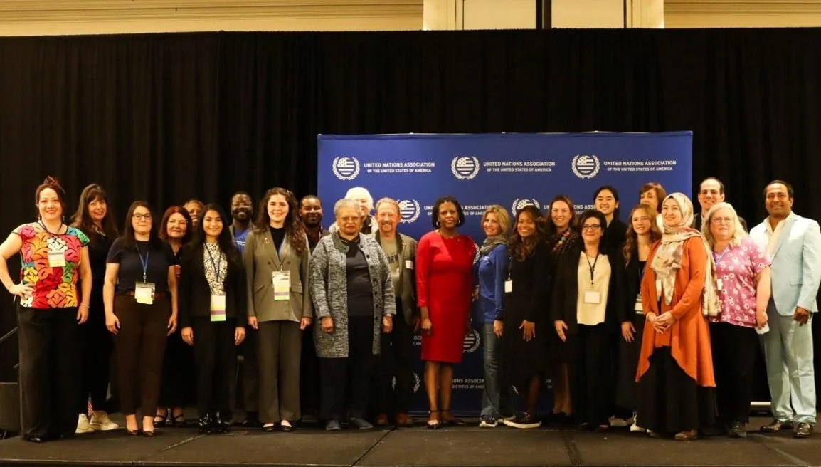 UNA-USA Executive Director Rachel Bowman Pittman stands with UN chapter leaders from across the United States. Pittman, the first woman and person of color in her position, took her final bow in her official role at the conference after 10 years of service to UNA-USA.